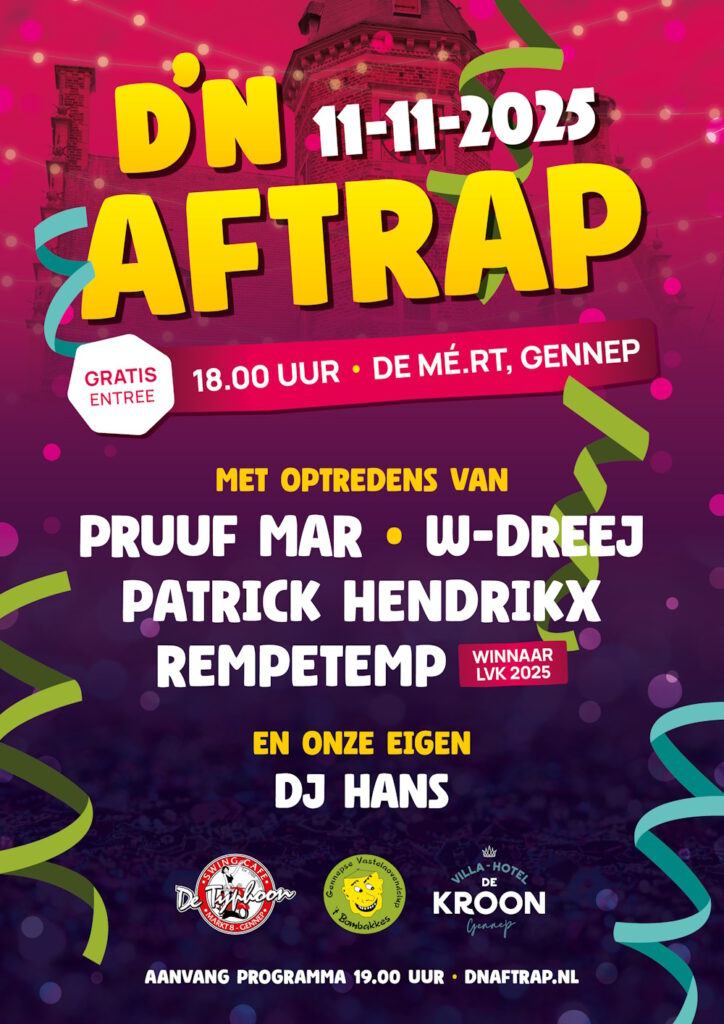 Op d’n 11e van d’n 11e gaon we ’t nïjje vastelaovesseizon oopene op de mé.rt ien Génnep. Op de poster kunde zie.n wélke artieste kômme optreeje bïj D’n Aftrap dit jaor.